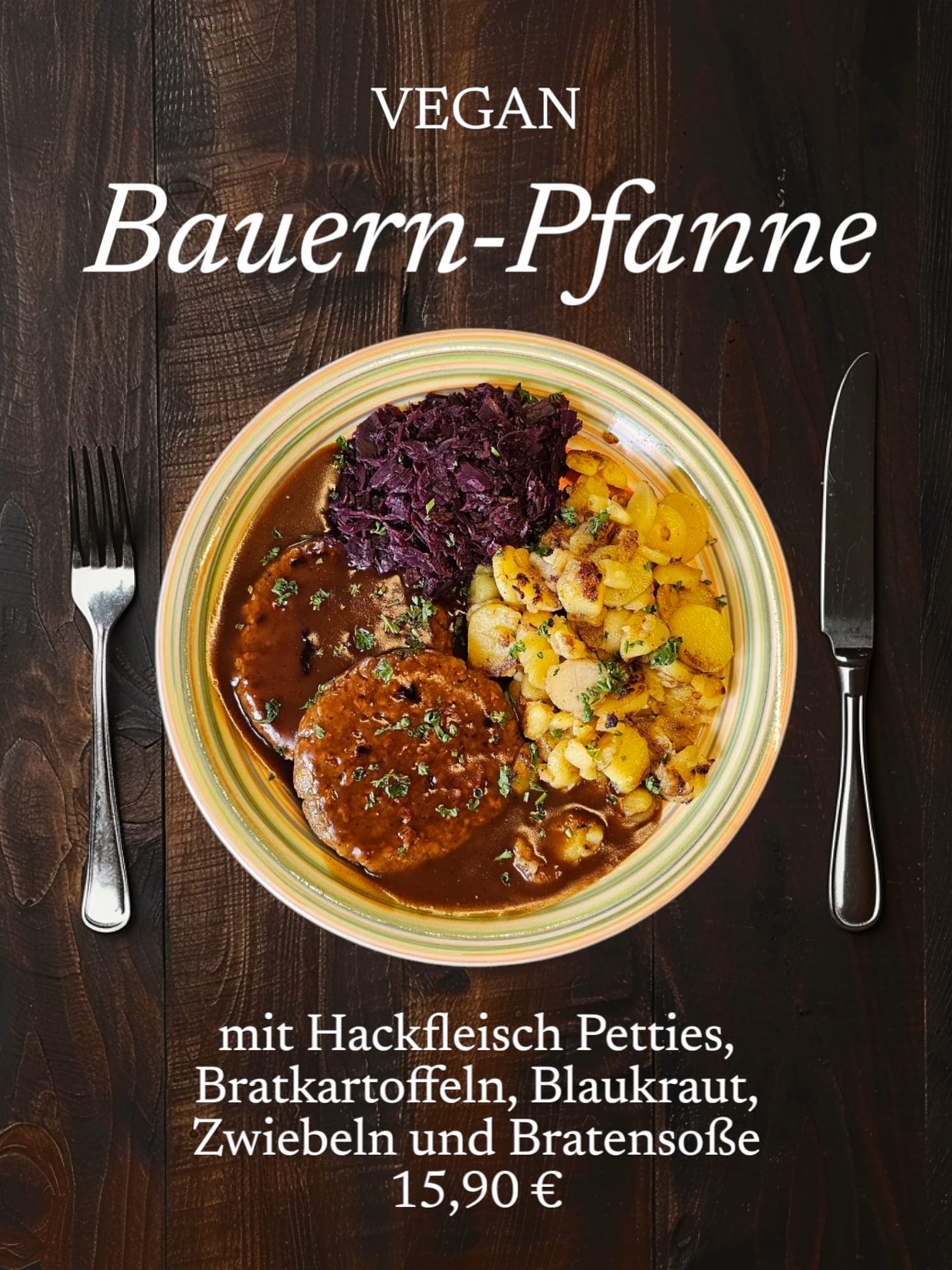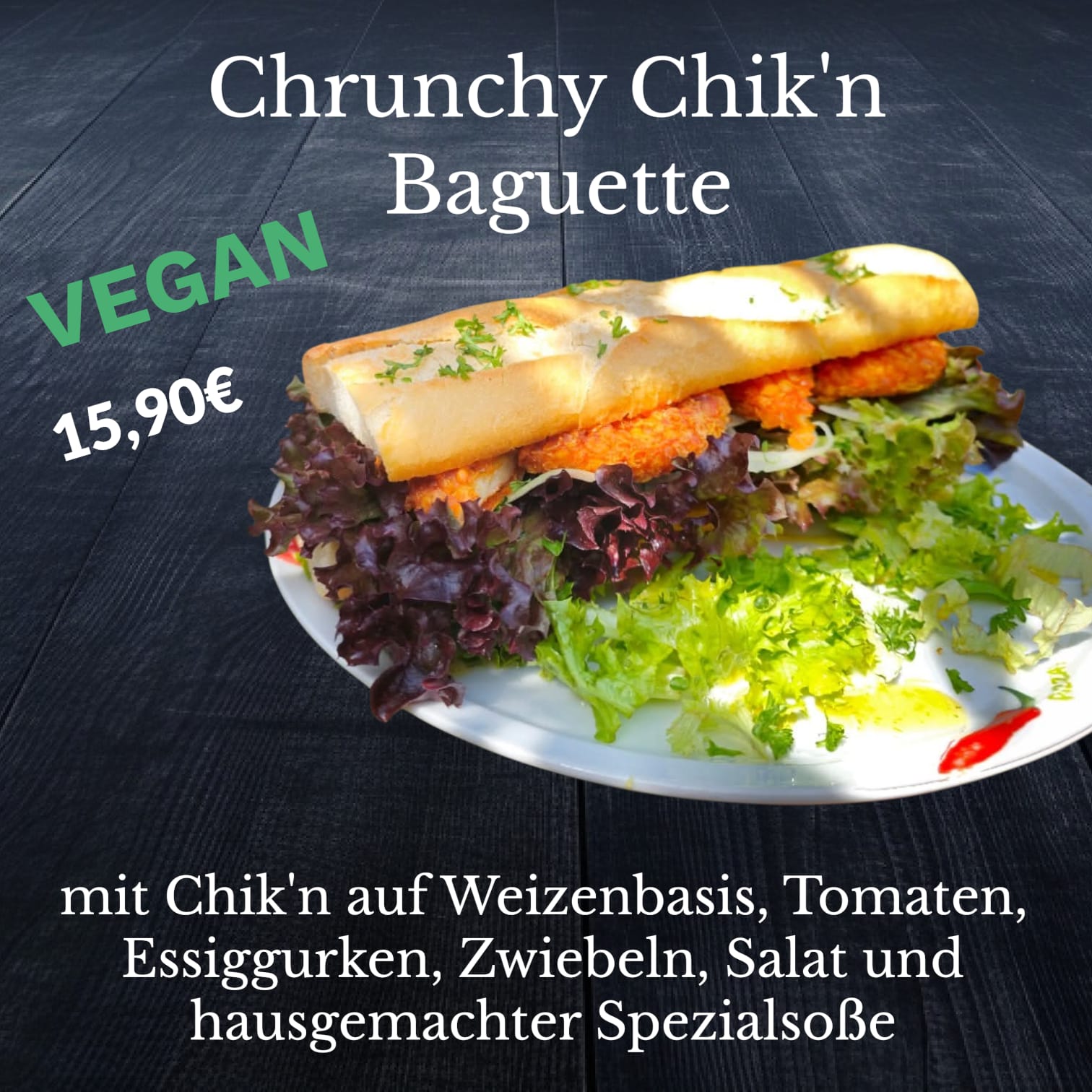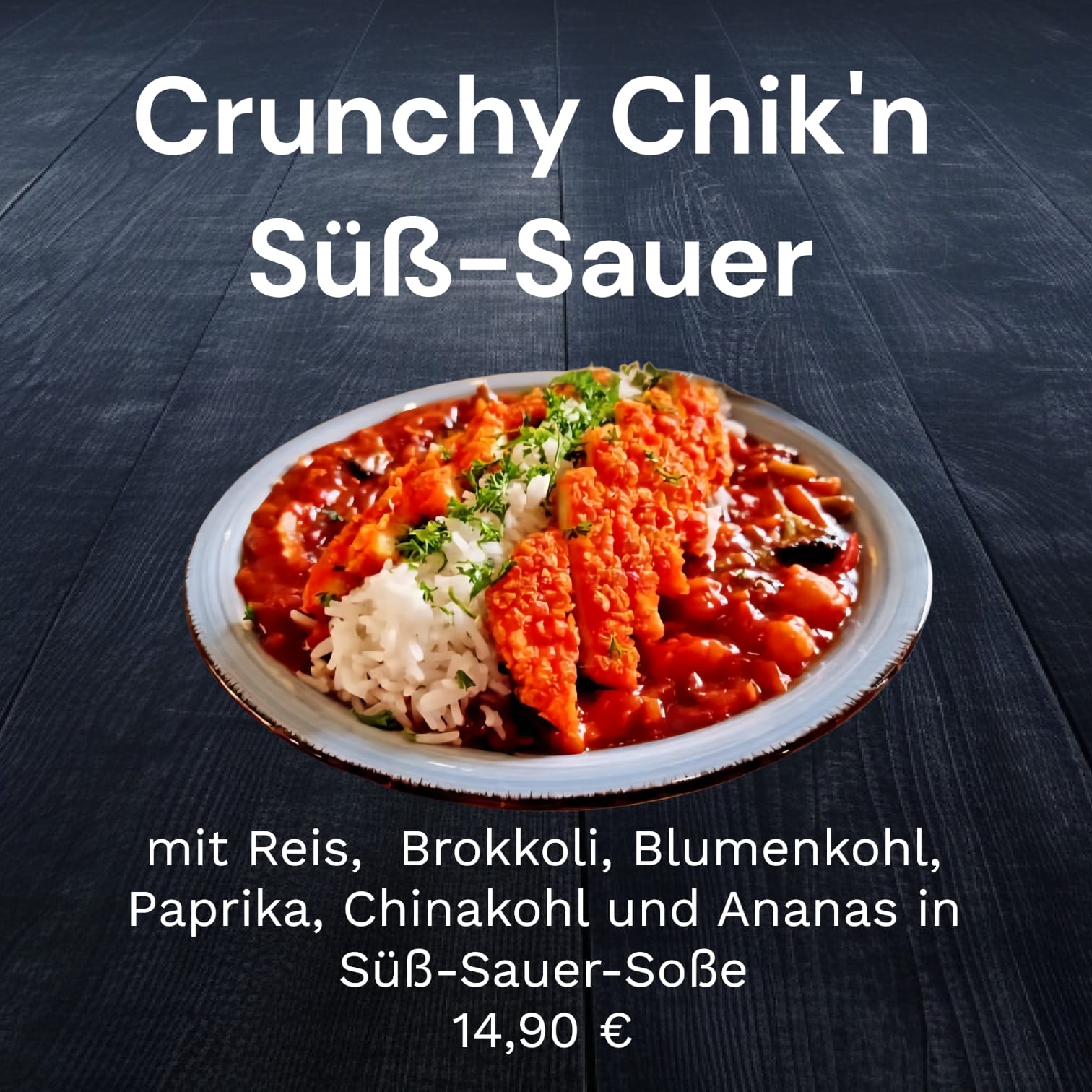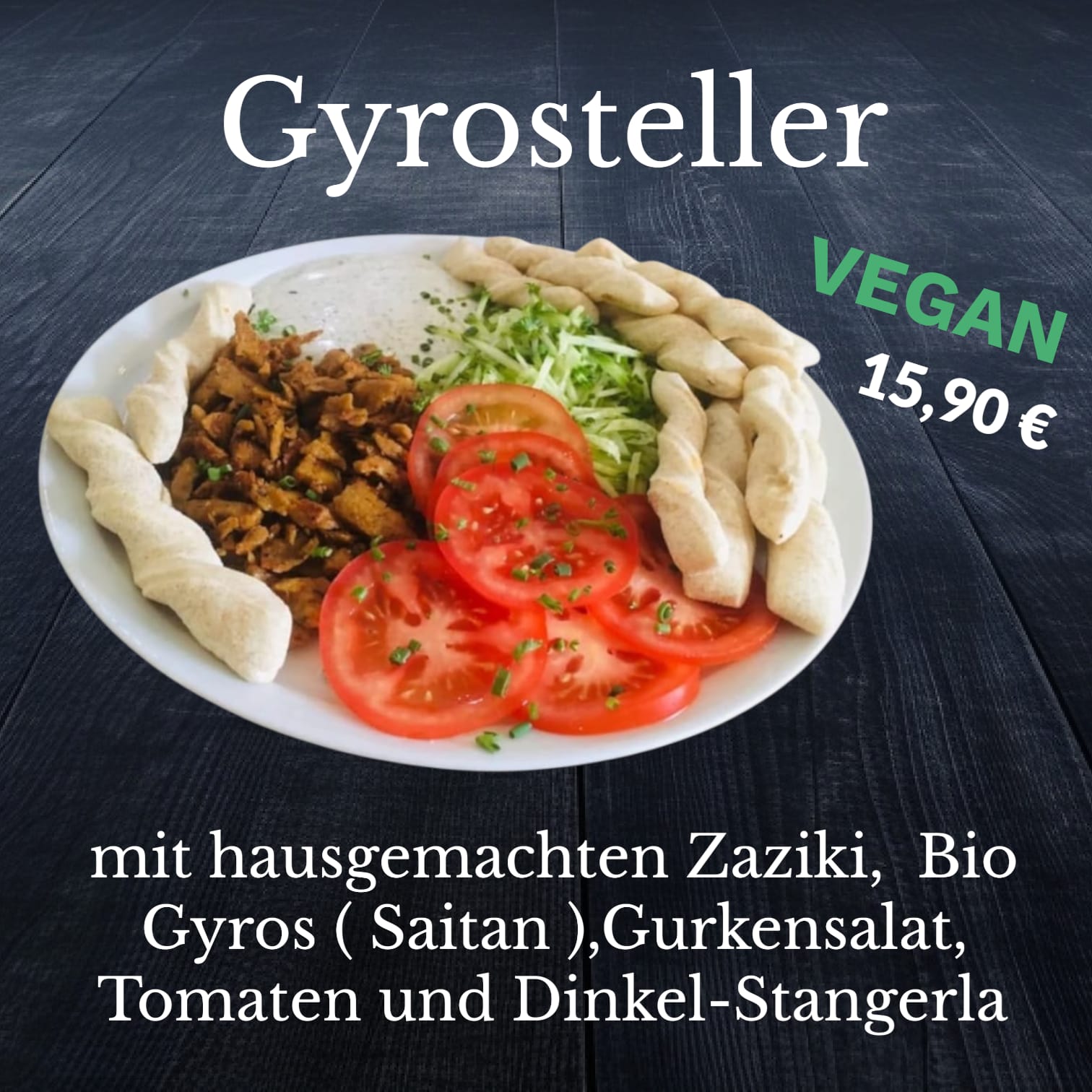 Gyros (vegan) 14,90 € mit veganem Zaziki, Gyros, Gurken, frischen Zwiebeln, Petersilie und Schnittlauch |