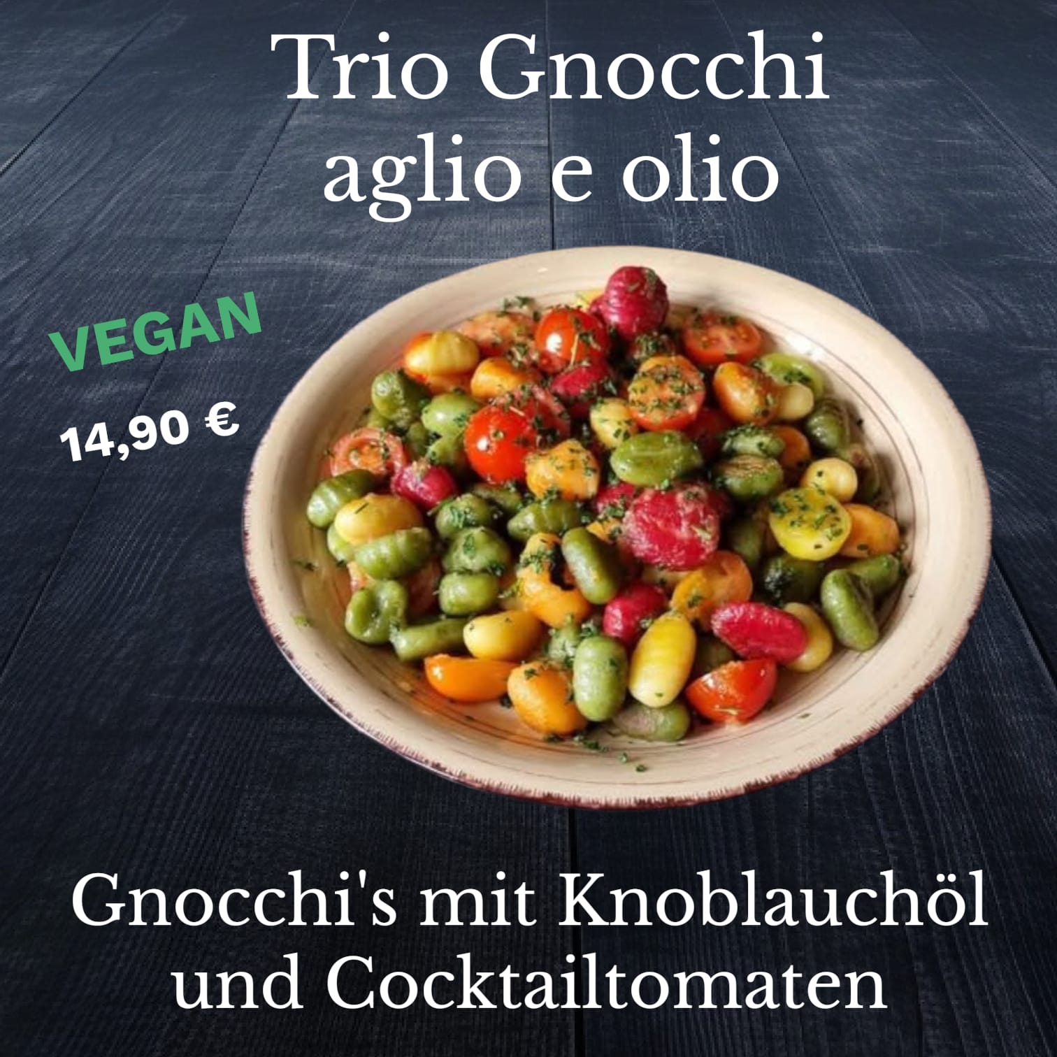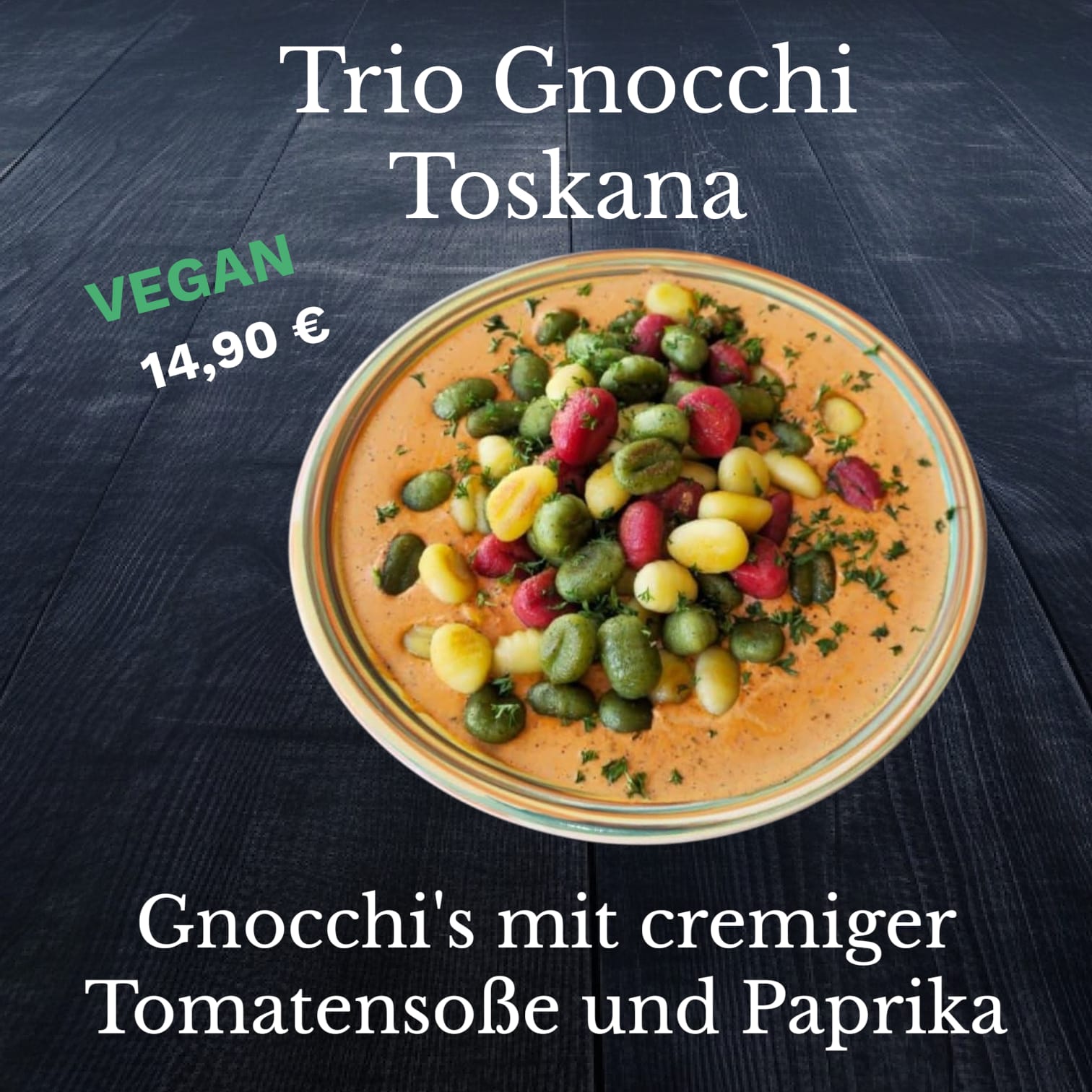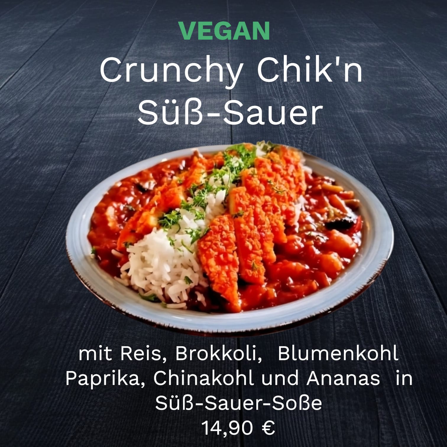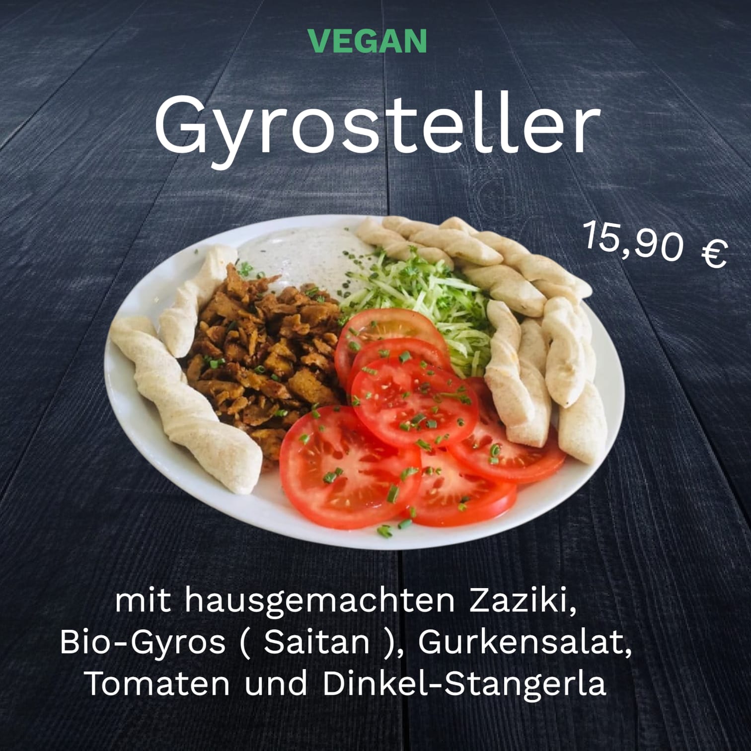 Gyros (vegan) 14,90 € mit veganem Zaziki, Gyros, Gurken, frischen Zwiebeln, Petersilie und Schnittlauch |