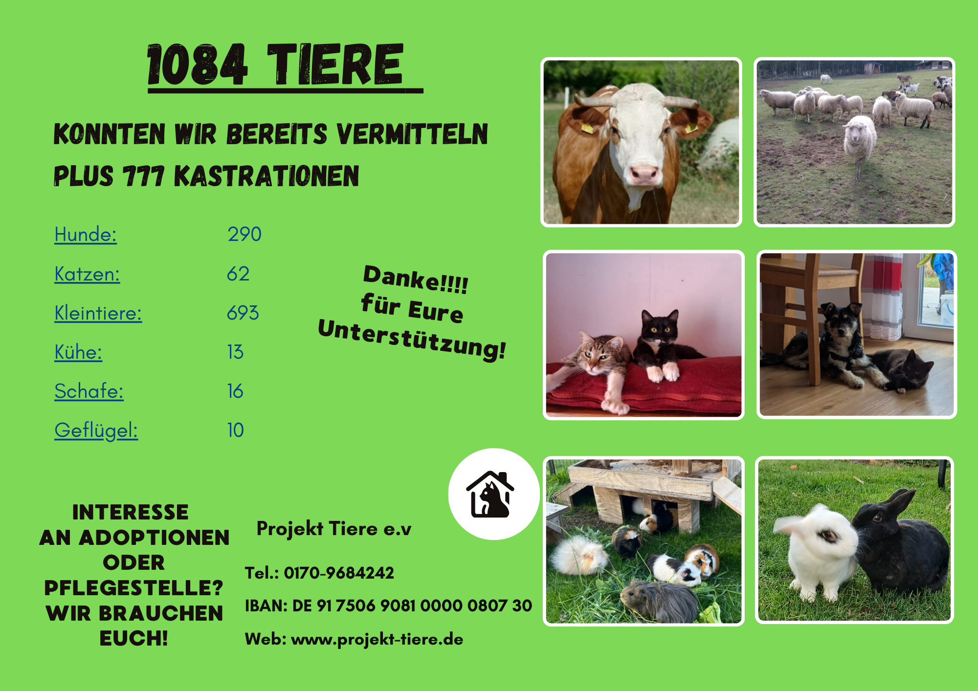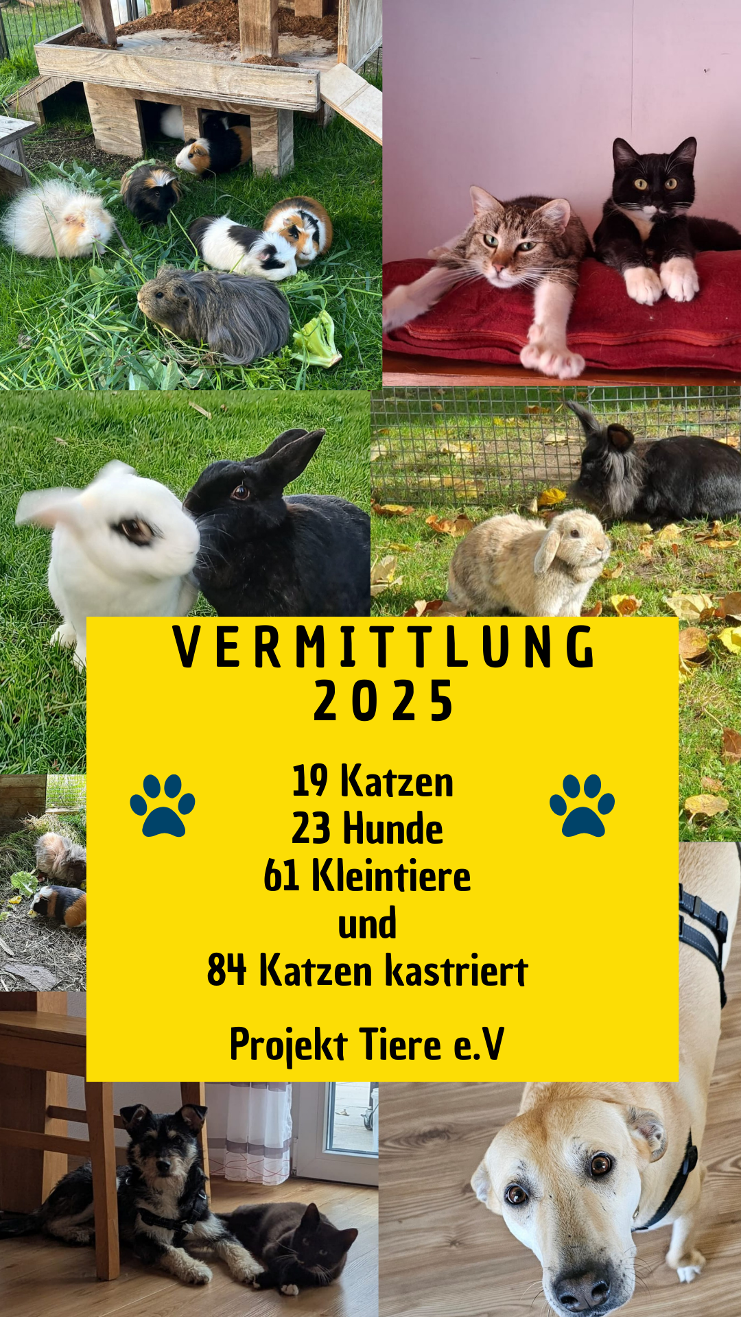 Bis heute (Januar 2026) konnten wir bereits 290 Hunde, 62 Katzen und 693 Kleintiere vermitteln. Ein großer Erfolg und ein großes Dankeschön an die Unterstützer und Adoptanten. Wir hoffen auch weiterhin viele Fellnasen den Weg in ein liebevolles Zuhause zu ermöglichen.